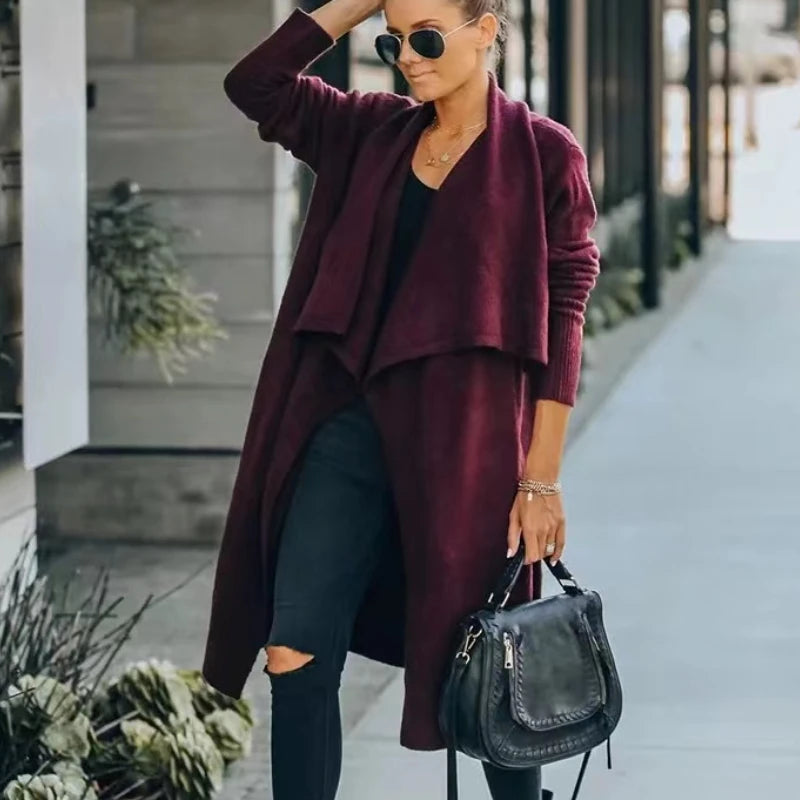 Wrap yourself in the luxurious comfort of the Ester Long Sleeve Knit Cardigan with Pockets. This boho-inspired cardigan features a turn-down collar and oversized fit, making it the perfect winter coat for any holiday occasion.