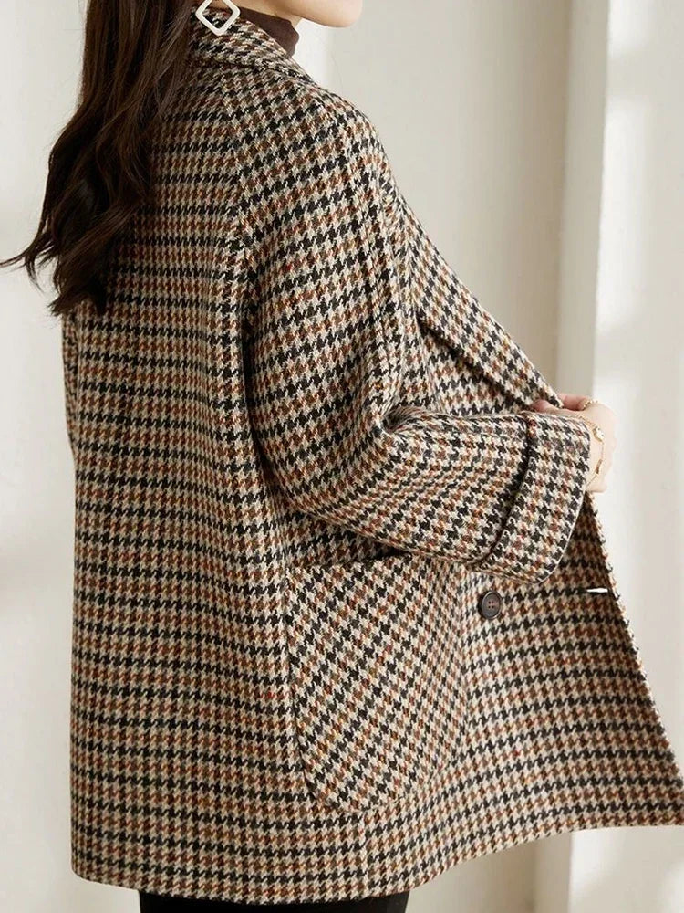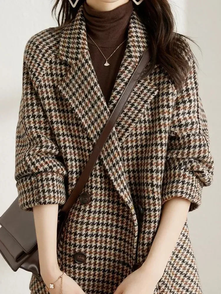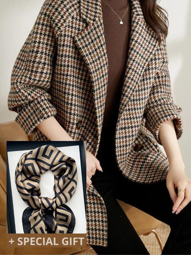 Experience the timeless style and cozy comfort of the CLAUDIA™ Elegant Winter Coat for Cold Days. This vintage houndstooth woolen blazer is designed to keep you warm while exuding sophistication.