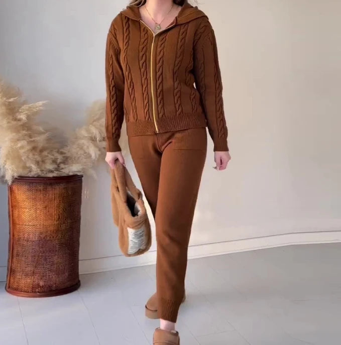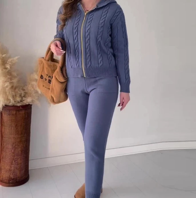 Feel the cozy embrace of the Relaxed Set for Women. Designed with a unique fried dough twist pattern, this hooded zip top and long pants suit offers a perfect blend of comfort and style, making it an ideal choice for casual home wear during the early winter.